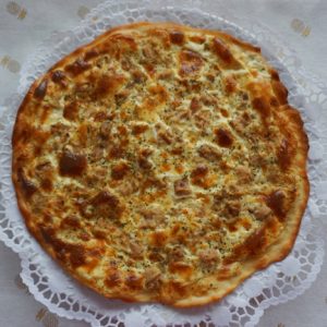 La pizza blanca es una pizza sin tomate. Esta versión lleva en la base crème fraîche (también conocida como nata fresca) y está deliciosa.